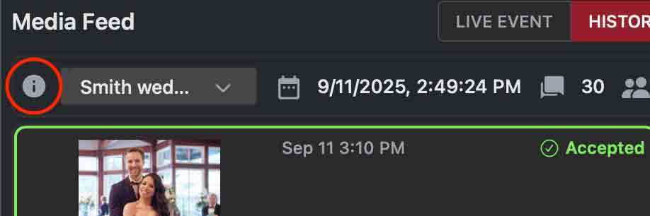 Click on the Media Feed icon in the toolbar, then click History to view the History. Use the pull down menu to select the past event that you want to view. On this page, you can view past events, summary stats on the event, along with pictures from the event. You can export individual pictures from events. You can do this from the Desktop app, from the mobile app or from the Ribalta webapp that your guest use to participate in your event. Anyone with the event link or QR code can share and download the event photos.