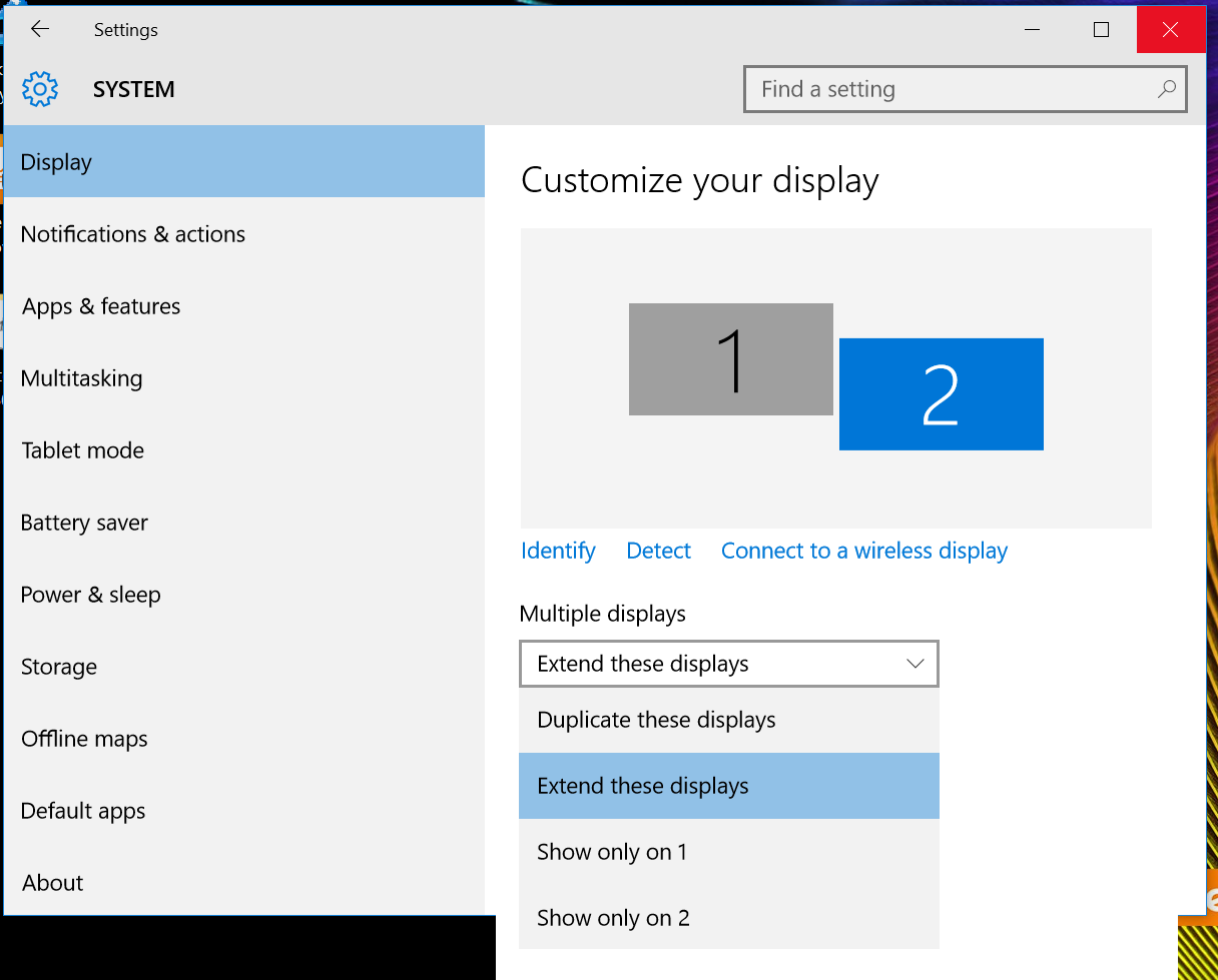 On Windows 10, go to All Settings → System (Display, Notifications, Apps, Power) → Display (see the picture below). Scroll down to Multiple displays and select "Extend these displays" from the pull down menu. If you scroll back to the top in this same section you will see both your displays, marked #1 and #2. Drag the displays to arrange the location of the display. For example, you can move the second display down. This will change where you need to move the mouse in order to put the mouse on the second screen. By moving the display down, you can avoid accidentally moving the mouse or dragging items over the output screen if you move the mouse to the left or right.
