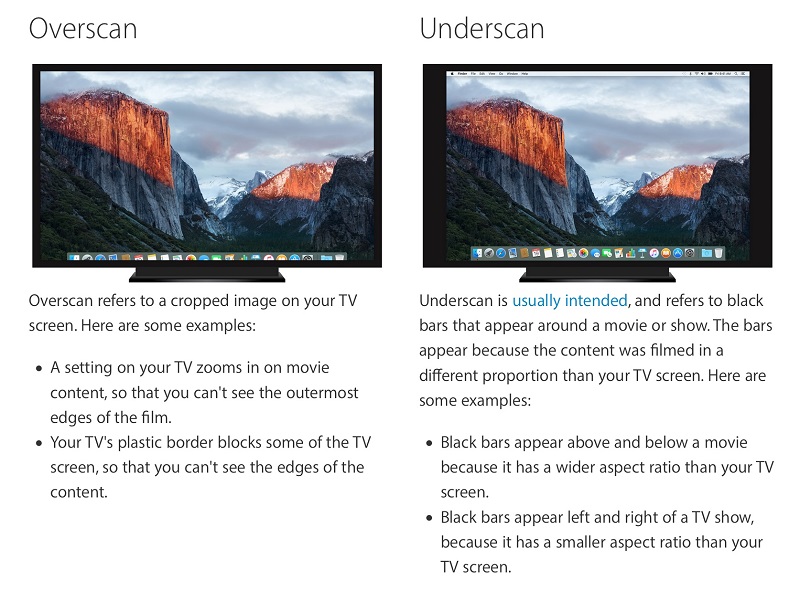 Sometimes the connection between your computer and TV or display may not be translated correctly. This can cause overscan or underscan. Overscan is when some of your TV image gets cropped off the screen; underscan is when the image does not cover the entire TV screen. See the below pic from Apple for a visual.