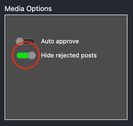 By default, Ribalta will not display any rejected messages. As soon as you reject a media, Ribalta will remove the media from the media feed. If you want to see rejected messages, go to settings and un-select hide rejected messages.