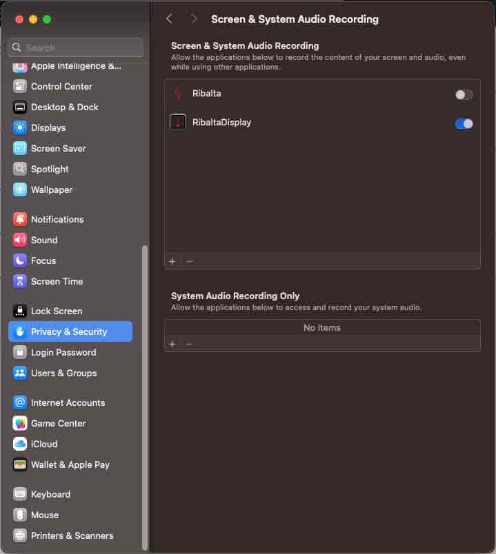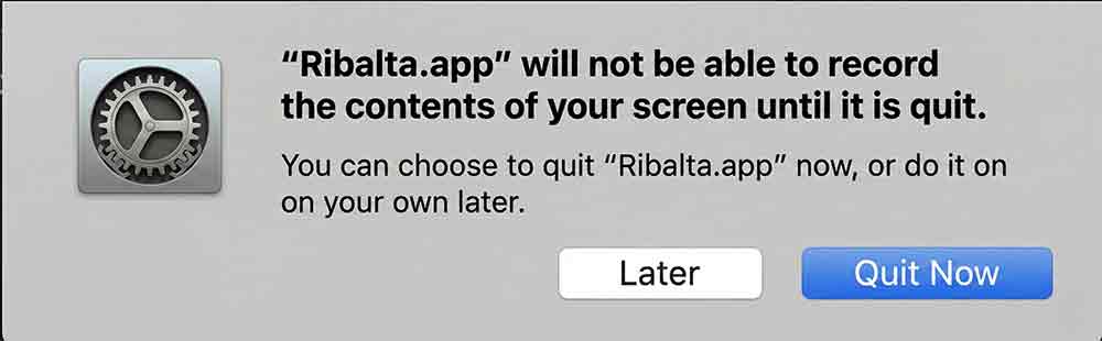 Find the RibaltaDisplay app in the list and make sure you enable it. Once you do that, you will get a prompt to quit Ribalta. Click Quit Now if you are ready to quit out of Ribalta. Ribalta needs to restart in order for the permission to take effect.