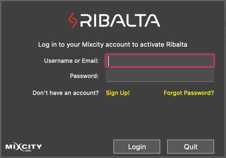 Launch Ribalta. You will be prompted to log into your account. Use the same username and password that you setup when you signed up for Ribalta. After downloading your account data, you will be directed to the main Ribalta application.