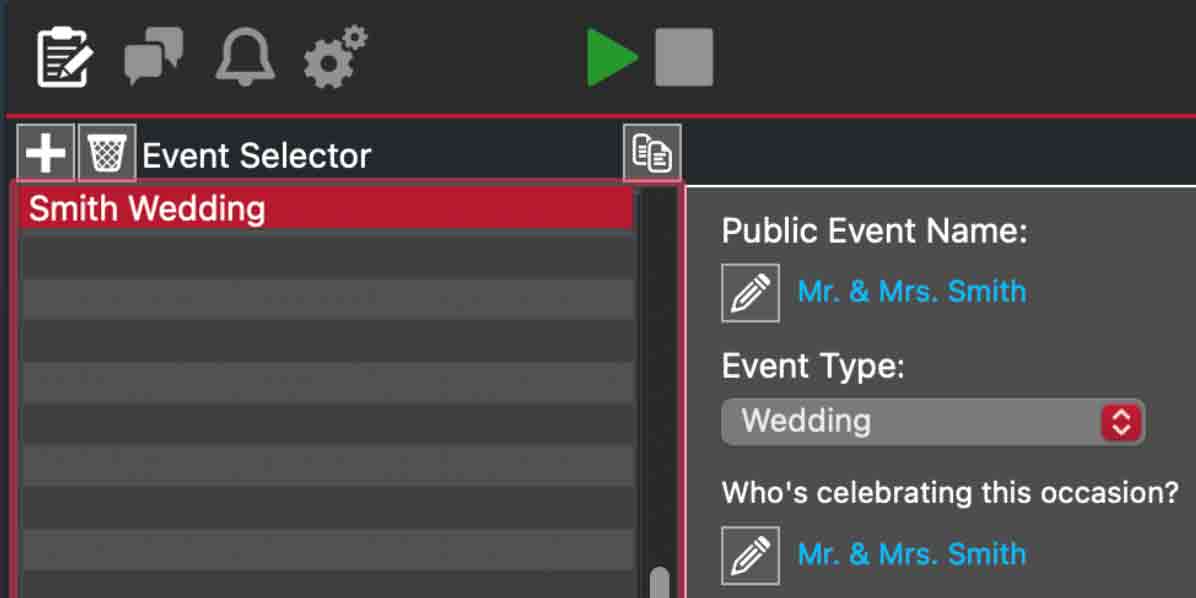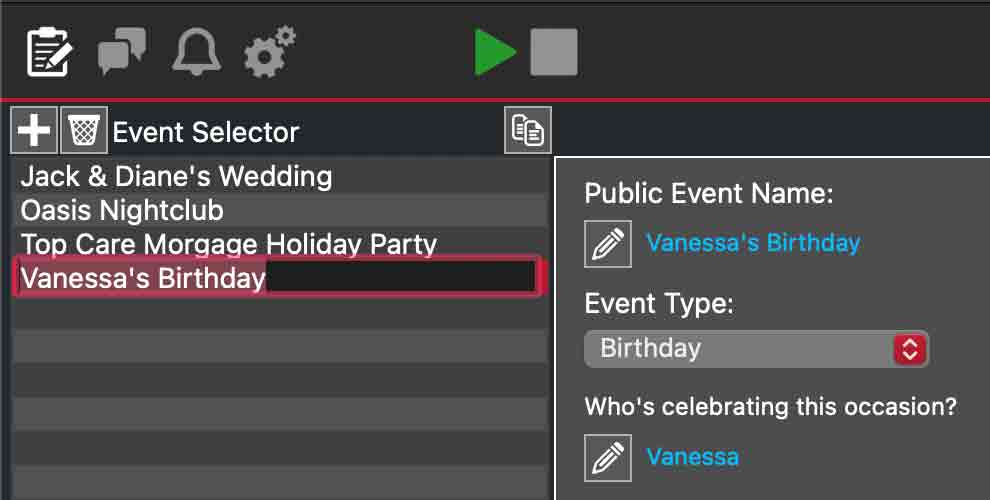 To start an event, select the desired Event Profile and press the green play button at the top of Ribalta.