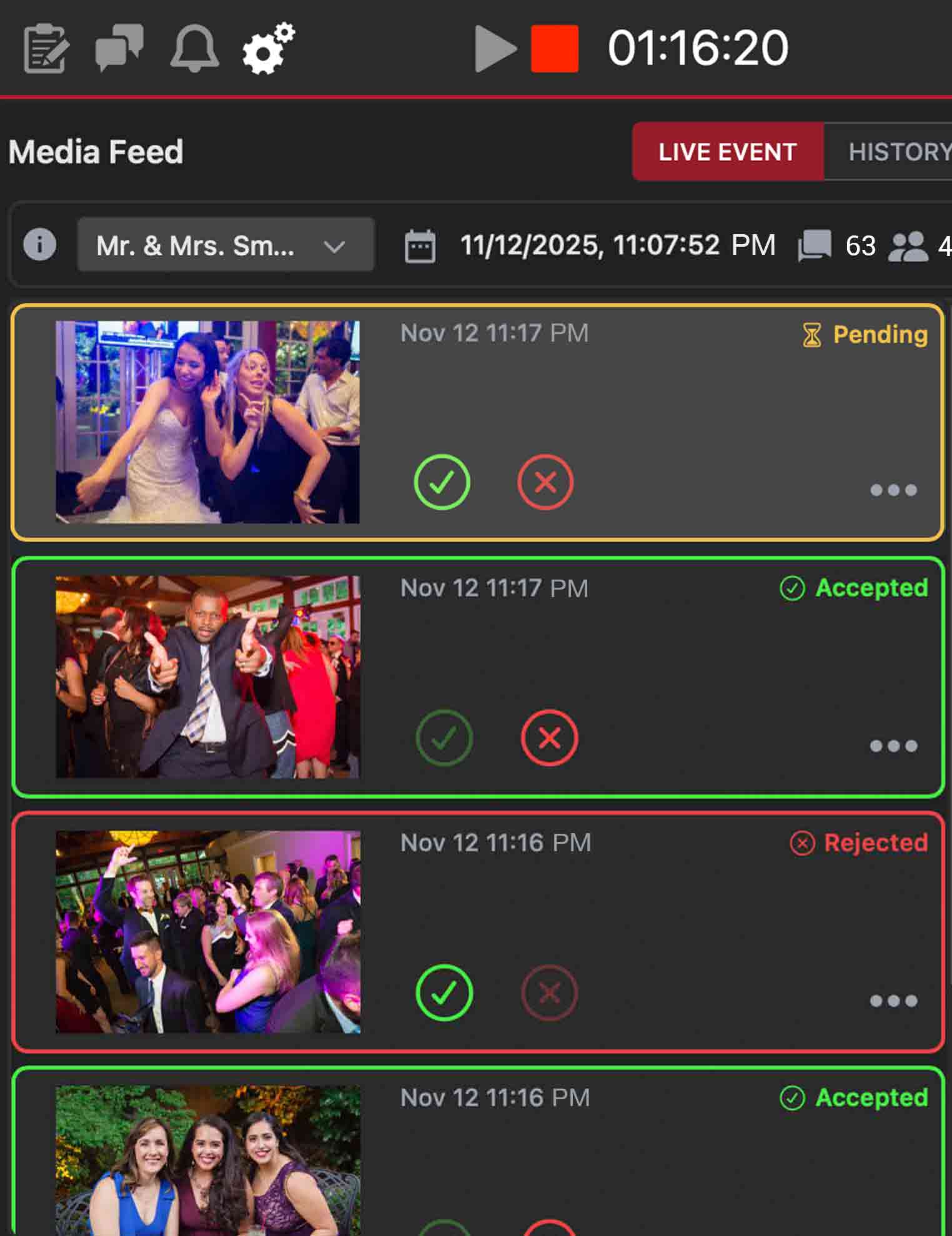 Click the green checkmark to approve a images to be viewable in the gallery & on the media wall display screen. The media will turn green indicating that it is now approved for display. Click the red X to reject messages from being seen. The message will turn red, indicating that it will not be viewable in the gallery & on the media wall. You can change the status of a message at any time. If you click approve by accident, simply highlight the message again and click the correct option.