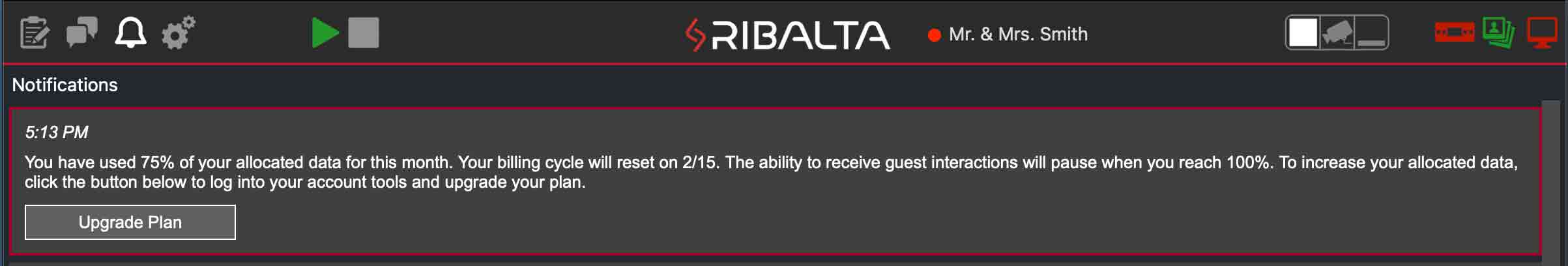 Ribalta has its own internal notification system. Notifications inform you of key things about Ribalta and your account such as a new version to download or Media Storage usage. You will see a notification count next to the notification icon, both in the toolbar and in the control window.